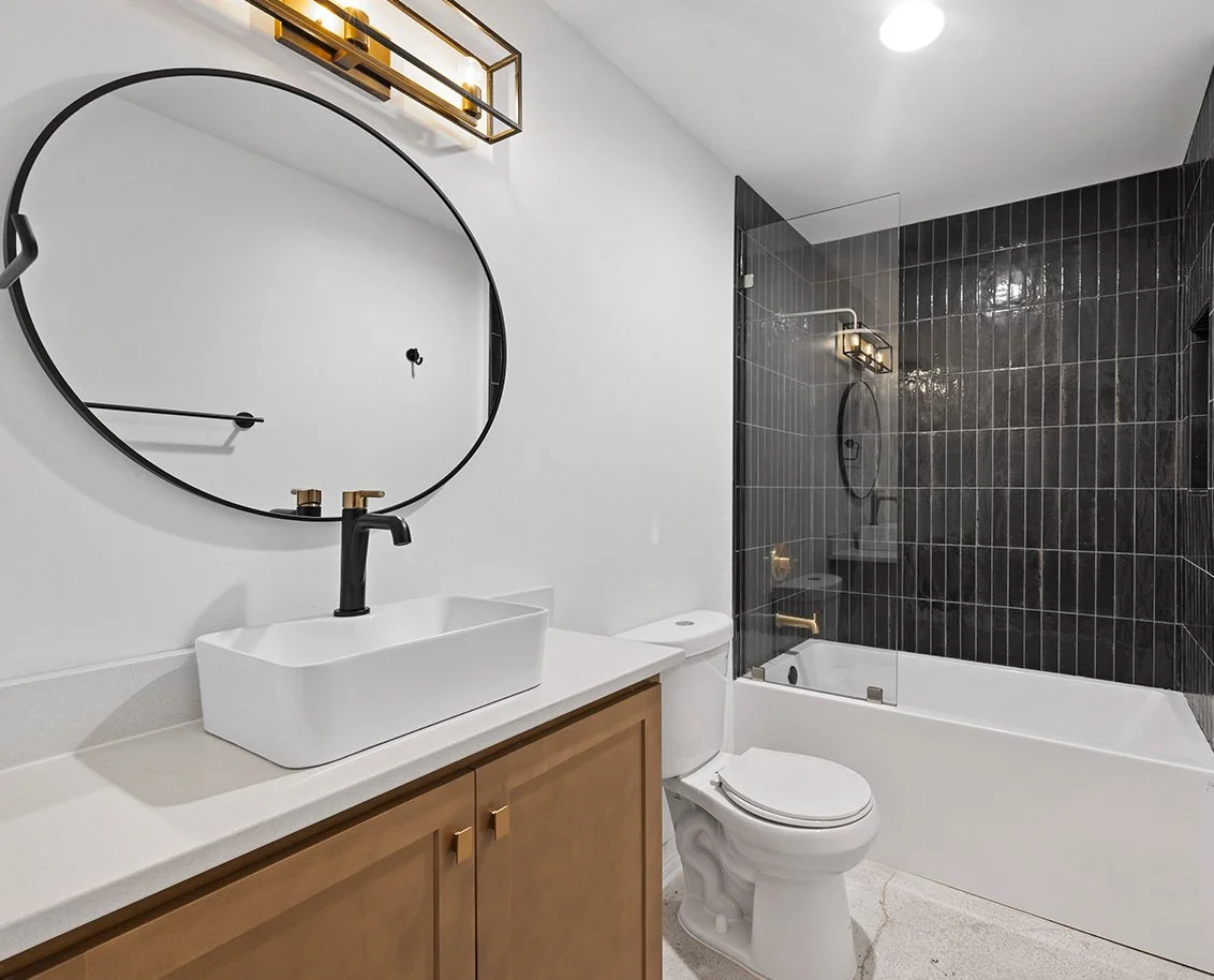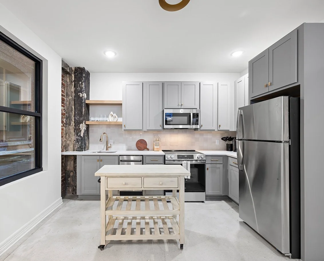 1 Bedroom, 1 Bath with Grey Kitchen, Quarts counter tops, black-tiled shower. Washer/Dryer hook-ups. South facing at the front of the building with exposed brick & views of Downtown towards Lookout Mountain.